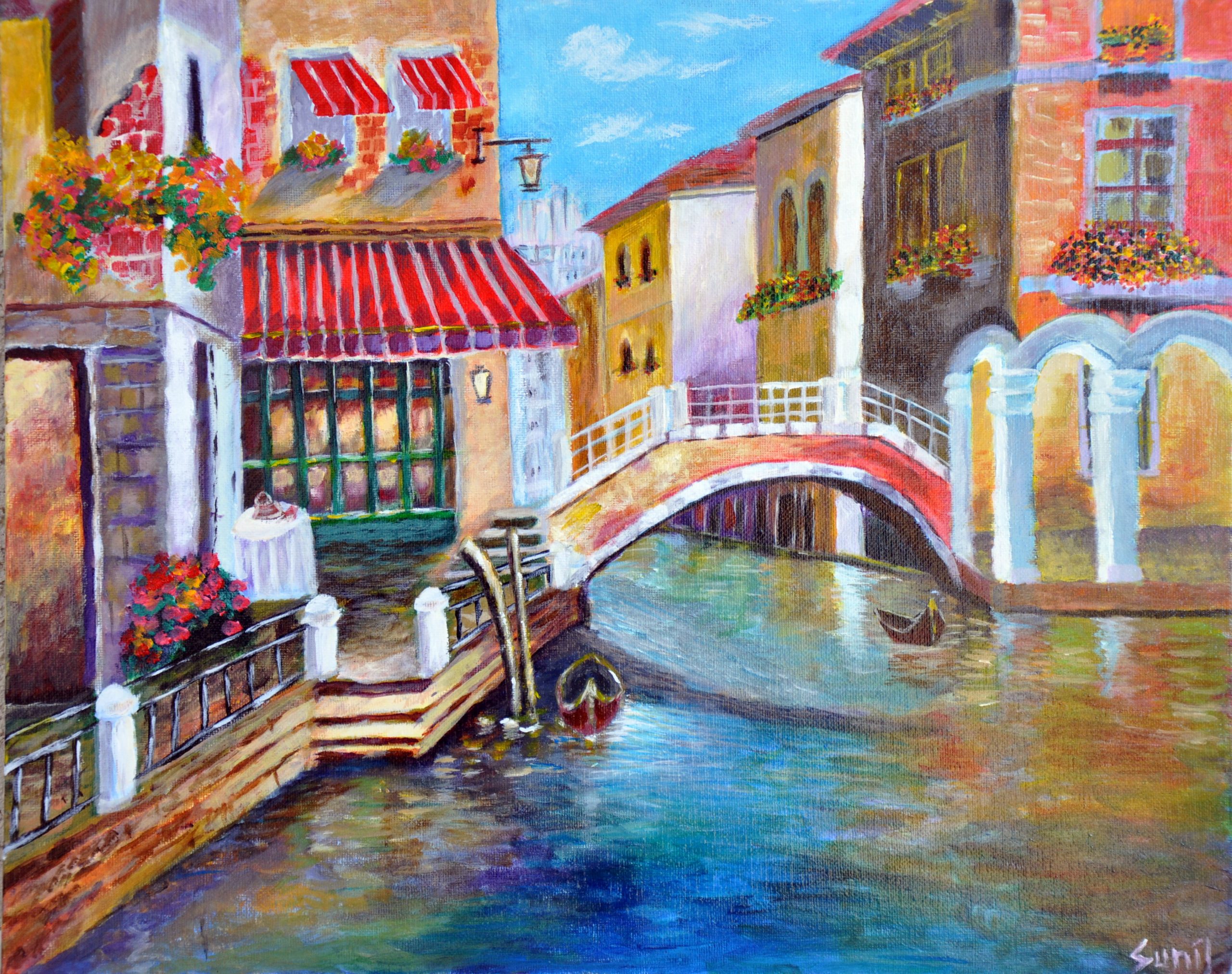 This painting beautifully captures the romantic charm of a Venetian canal scene. A graceful arched bridge stretches over glistening, reflective waters, while colorful old-world buildings line the canal on both sides. Their facades are adorned with vibrant flower boxes and red-striped awnings, creating a warm, inviting atmosphere. On the left, a cozy café terrace with a single seated figure evokes a sense of quiet contemplation and timeless European elegance. The soft brushwork and vivid palette of blues, golds, and reds bring life and movement to the water and architecture, infusing the scene with warmth and serenity.
