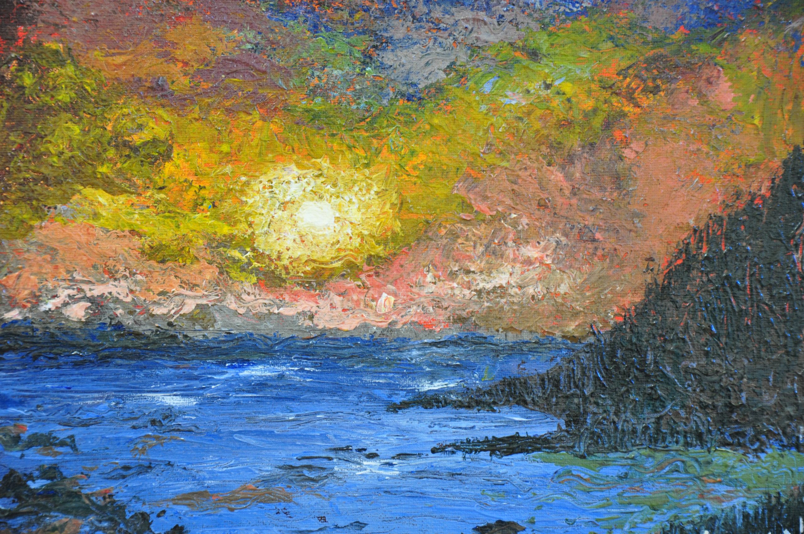 The sun, partially obscured by clouds, radiates a brilliant white-yellow glow that diffuses into the surrounding color palette, giving the impression of overwhelming light. Below, the ocean is painted in deep and vibrant blues, with hints of reflective light that echo the sky’s palette. Waves ripple gently toward a rugged, shadowed coastline on the right, adding depth and grounding the composition.