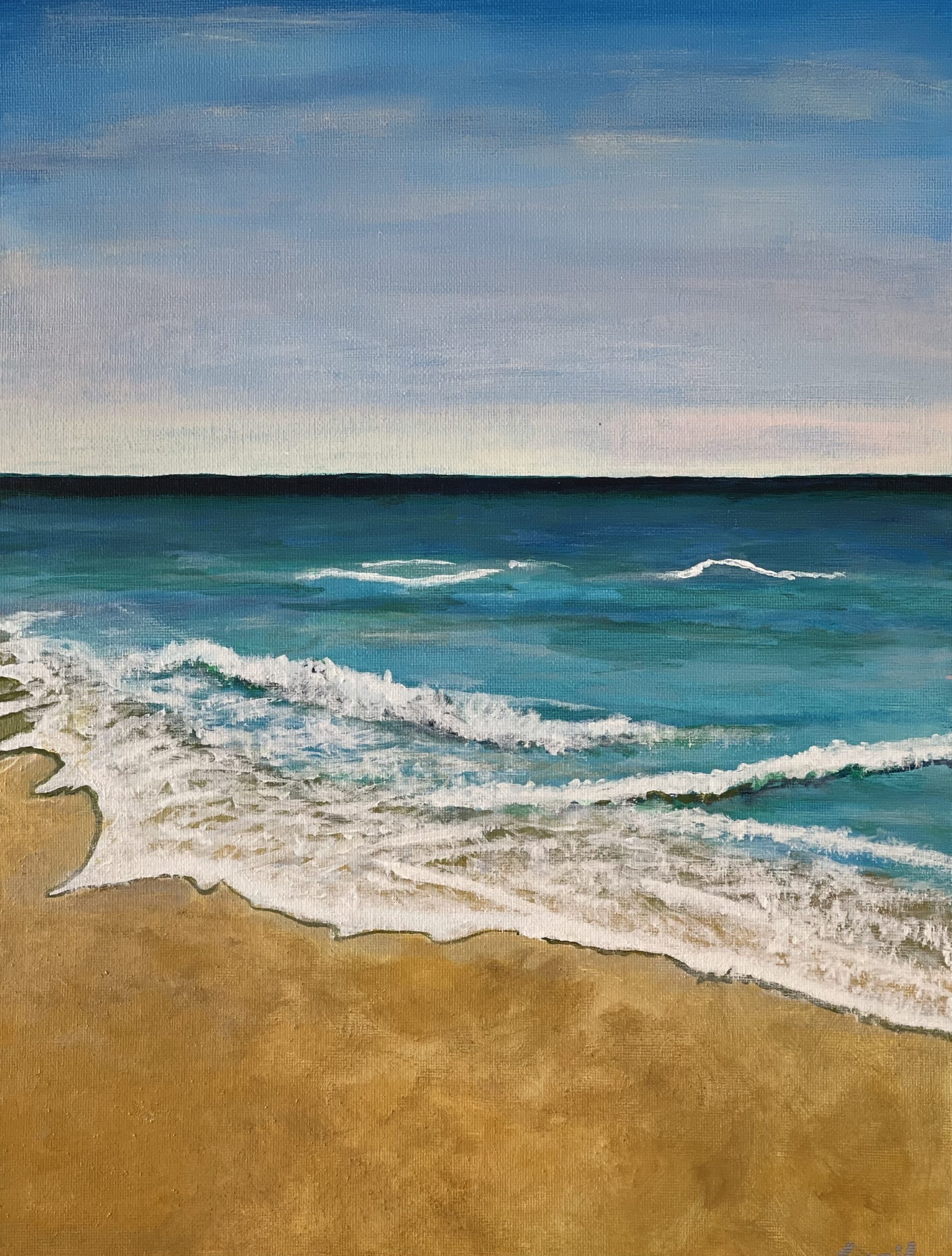 A soft blending technique is used to depict the sky and ocean, contrasting with the textured brushwork of the waves and foam, adding movement and realism. The warm tones of the sand balance the cool hues of the water, creating a harmonious and inviting coastal atmosphere.