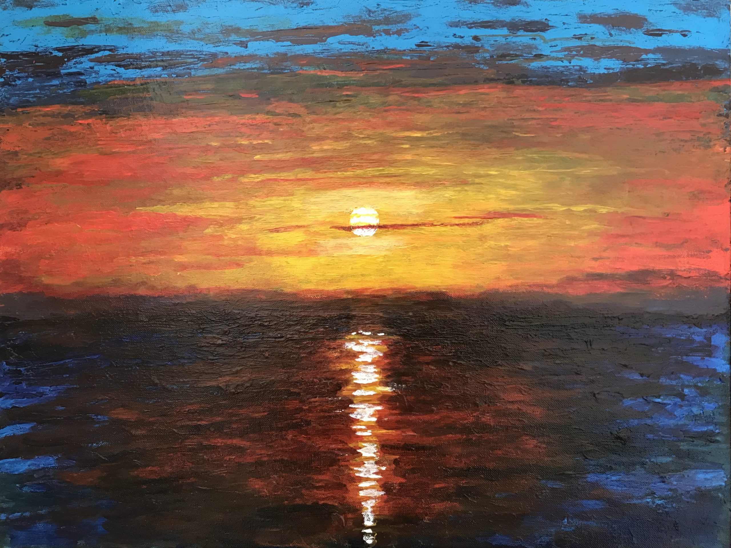 This painting radiates the serene and mesmerizing beauty of a sunset over the ocean. The glowing sun sits low on the horizon, casting a brilliant golden reflection across the rippling water. Rich layers of color—from deep cobalt blue and violet in the sea to fiery hues of red, orange, and gold in the sky—create a vivid sense of warmth and depth. The brushstrokes are bold and textured, giving the scene a tactile, almost dreamlike energy. The transition of colors from bright turquoise at the top to deep indigo below captures the fleeting magic between day and night.