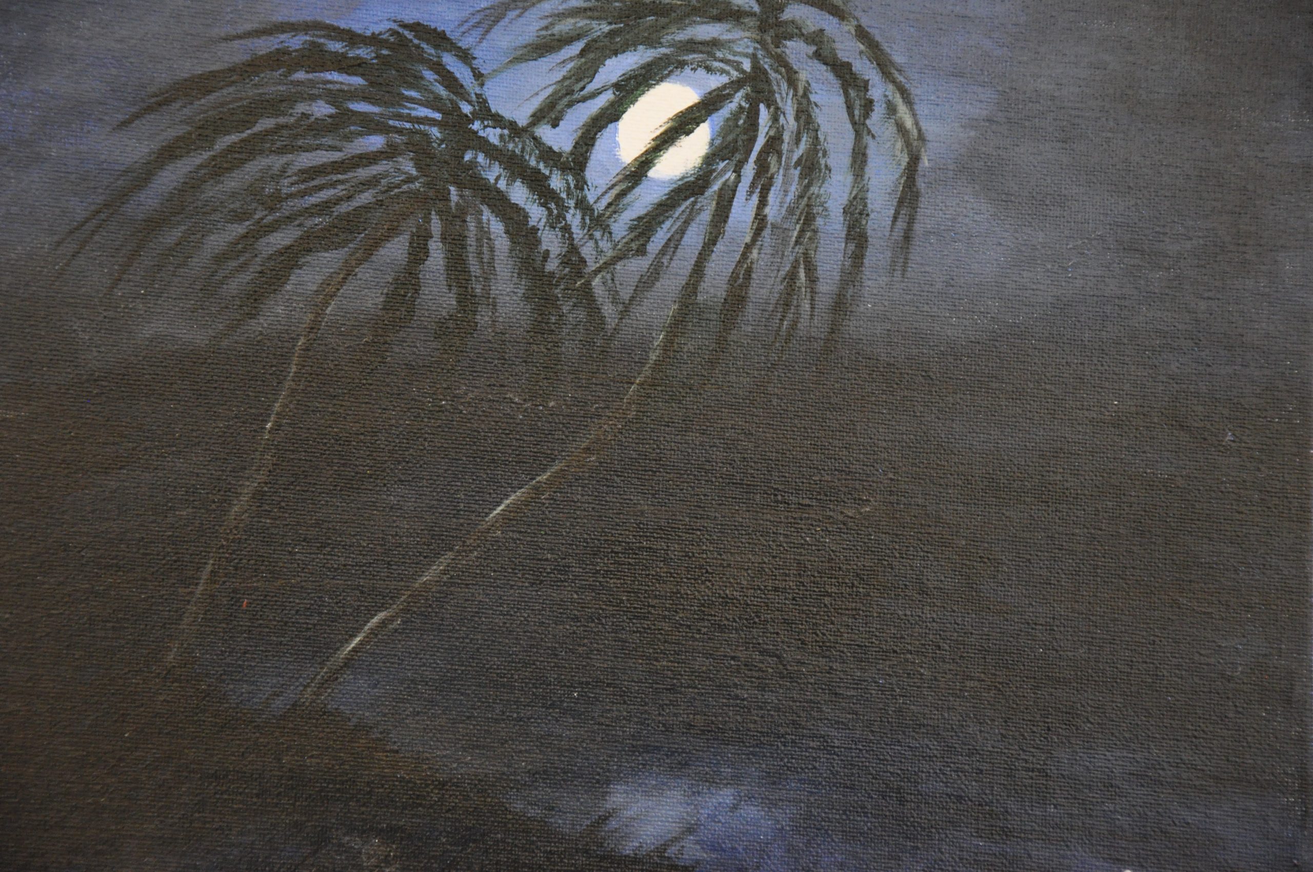 This painting conveys a moody, atmospheric scene of a tropical night under moonlight. Two slender palm trees stand silhouetted against a softly glowing full moon, their fronds swaying gently as if stirred by a nocturnal breeze. The moon casts a silvery light that filters through the feathery leaves, creating subtle contrasts between light and shadow.